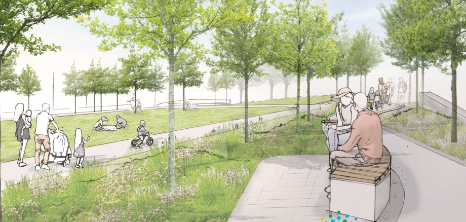 - sichtbare Wasser-Elemente zur Klimaanpassung und Aufenthaltsqualität.
