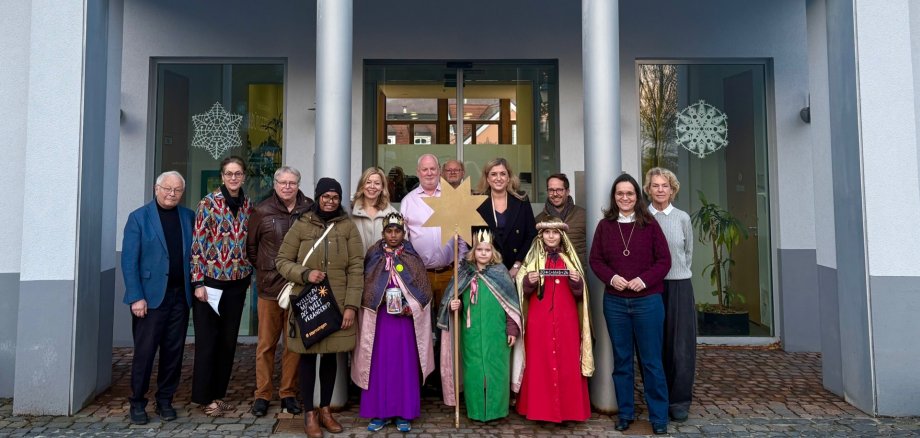 Bürgermeisterin Beatrice Schenk-Motzko, die Magistratsmitglieder und Rathausmitarbeitende empfingen die Kinder, die als Heilige drei Könige „Caspar“, „Melchior“ und „Balthasar“ aus der Weihnachtgeschichte unterwegs waren, und freuten sich über den Segensspruch für das Haus.